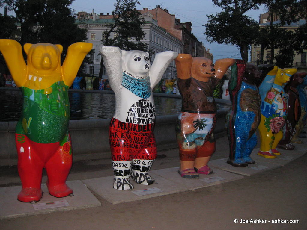 A big hello from St. Petersburg in Russia as our Elbrus expedition is officially underway to climb the highest mountain in Europe. After a long journey with a few delays, our team is fully assembled as all members have safely arrived in town. Although most team members flew in from the USA, we had two members join us from Canada and one from as far as Tasmania (Australia). Guiding and climbing with us are Vern Tejas and Carol Tejas. After checking into our hotel and a brief introduction, we were treated to a nice dinner of Beef Stroganov along with a Russian salad and capped off by a rich dessert. We seem to have a fun team with a very interesting background. After dinner, we walked around for a few minutes and checked out an exhibition in the town center showcasing many bear statues each representing a different country, there were over 100 bears.