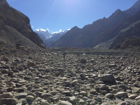 I left Askole at 6:25 AM this morning and arrived in Jhula at 11:15 AM. A combination of high temperatures and very rugged terrain made for a difficult trek. Everything you hear and read about the trek to K2 base camp is real. Unlike the well maintained trails in the Khumbu on the way to Everest Base Camp, the trails here are a combination of loose rock, high and dangerous exposure and even deep sand. Nonetheless it’s very scenic as you climb along the river and you’re surrounded by magnificent looking peaks. This also made for an arduous task because it seems every time I looked up to enjoy the scenery, my foot twisted on a rock and almost sprained an ankle. You really can’t keep your eyes off the trail or something bad will happen. The weather is HOT HOT HOT and was begging for any cloud cover. It felt like I was crossing the Mojave Desert or Sahara albeit at high altitude close to 3,300m/11,000ft. Some members are dehydrated and a fellow climbe from a local team trekking with us fainted for a few minutes but he’s now OK. We’ll take a much needed rest this afternoon, eat an early dinner and shoot for another early start tomorrow morning to Paiju.